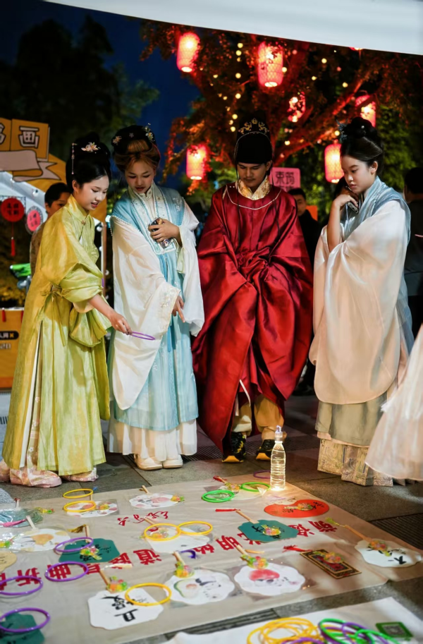 与书法展厅的静谧形成鲜明对比,同步开放的“束筠”文化非遗市集热闹非凡,各类创意生活文创、非遗手作琳琅满目。市集一角的传统游艺区更成了欢乐焦点,蹴鞠、投壶、夹月饼等互动摊位前排起长队,欢呼声与喝彩声此起彼伏。嘉宾们穿梭于各个摊位之间,欣赏雅乐表演、品尝精致茶点。中外学生们还穿上宋制、明制汉服穿梭游园,市集里的每一次驻足、每一次互动、每一场欢笑,都让文化在烟火气中自然传播,让传统之美走进日常、触达人心。
